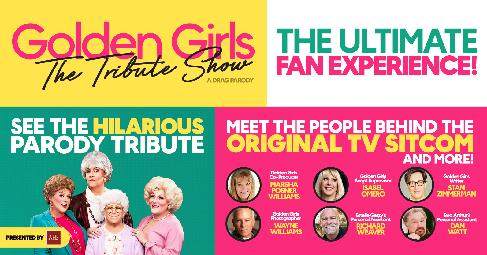 VIP ticket holders can meet the Q&A panel after the show, and pose for photos with the tribute show cast, taken by Golden Girls photographer Wayne Williams!